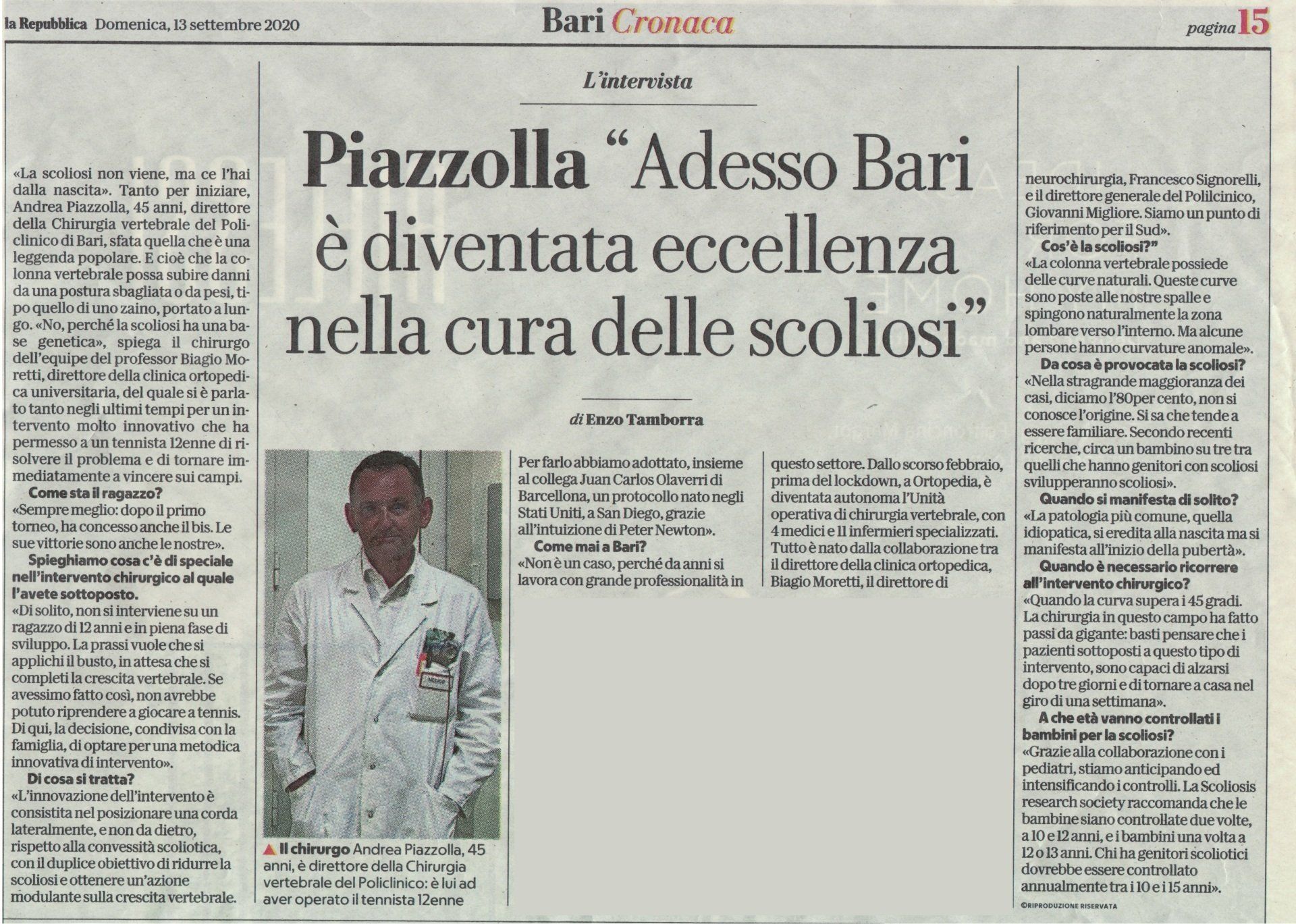 Forte di una consolidata esperienza in campo vertebrale, il dottor Andrea Piazzolla è direttore della Unità Operativa Semplice Dipartimentale di Chirurgia Vertebrale e Centro Scoliosi presso la Azienda Ospedaliero Universitaria "Policlinico" di Bari. Altamente specializzato nella diagnosi e nella cura di deformità vertebrali di vario tipo, come scoliosi e cifosi, è socio delle società di chirurgia vertebrale più prestigiose al mondo, tra cui:
